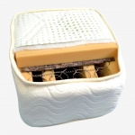 Perimetral, pe marginea plasei cu arcuri este adaugată o margine antilasare cu spumă poliuretanică de înaltă densitate SISTEM BOX. Peste plasa de arcuri se aşează (pe ambele feţe) 2 straturi de pâslă thermofelt, cu densitatea de 1100 g/m2, apoi o placă poliuretanică cu densitatea de 25 kg/m3 şi cu grosimea de 6 cm, pentru a crea o zona de confort sporit. Materialul exterior este realizat din 3 straturi, dublu matlasat complet din Bumbac, peste care se înserează un strat de vatelină, cu densitatea de 200g/m si TNT 12g/m2.